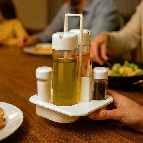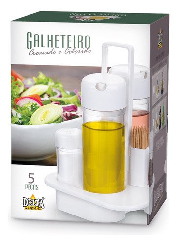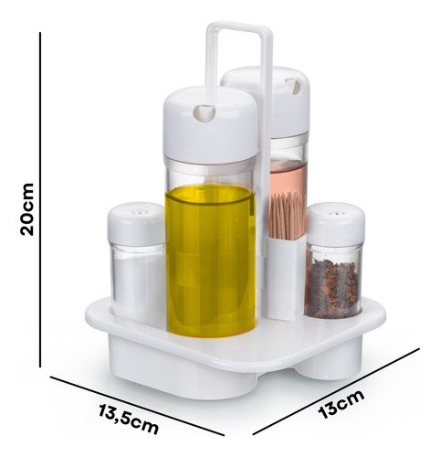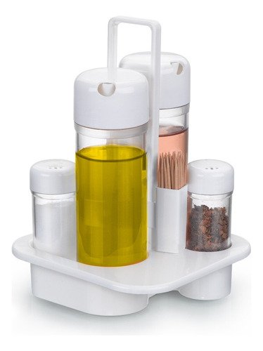 Deixe sua mesa e cozinha mais organizadas e práticas com o Galheteiro 5 Peças em Plástico de Alta Resistência. Ideal para armazenar e servir azeite, vinagre, sal, pimenta e ainda conta com um porta palito de dente funcional. Seu design compacto e moderno combina com qualquer ambiente, sendo perfeito para o dia a dia ou para servir à mesa com elegância.